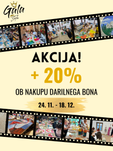 Od 24. 11. do vključno 18. 12. ti pri nakupu darilnega bona podarimo dodatnih 20 % vrednosti , ki ti jo pripišemo na darilni bon!