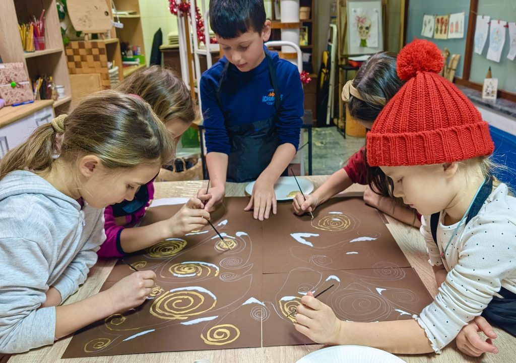 Dan danes otroci odraščajo v svetu, kjer so zasloni stalno prisotni. Prekomeren čas na telefonih in tablicah pa dokazano zmanjšuje koncentracijo in spontanost. Namesto prepovedi ali omejevanja, skupinsko ustvarjanje ponuja drugačno pot. Umiritev, fokus in stisk s sabo ter drugimi. Ko je otrok vpet v proces, ki zahteva gibanje, pogovor, delo z materiali in skupno reševanje likovnih izzivov, telefoni preprosto izgubijo svojo privlačnost.