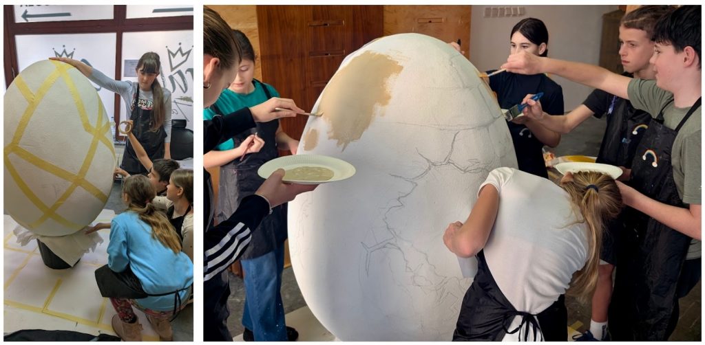Pri ustvarjanju sodelujejo učenci iz naših programov Radovedni umetnik (9–11 let) in Mladi mojster (12–14 let), ki so se izziva lotili kot prava ustvarjalna ekipa. Njihova naloga je okrasiti veliko velikonočno jajce, visoko več kot en meter, kar predstavlja zanimiv umetniški izziv in priložnost za skupinsko ustvarjanje na res velikem formatu.